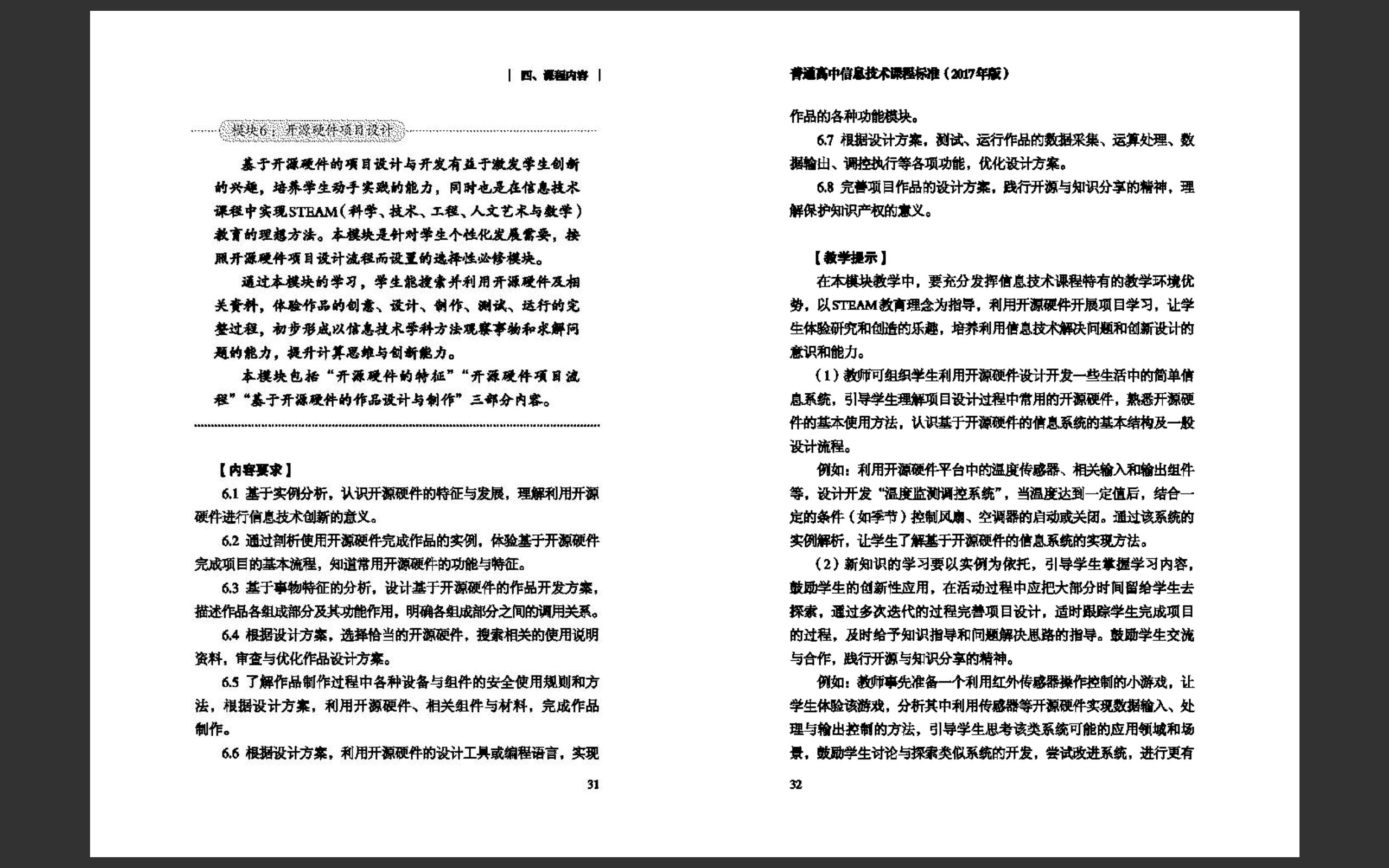 本模块是针对人工智能的发展特征,从基础知识与应用、简单人工智能应用模块搭建及开发等方面设置的选择性必修模块。 开源硬件项目设计