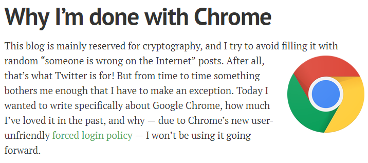 随着这种新的自动登录机制的曝光,大量用户在推特和新闻评论区发表自己的不满,他们更希望由自己决定登不登录浏览器或其他服务,而不是由 Google 私自来帮他们做决定。 来自约翰斯·霍普金斯大学的著名密码学专家、计算机系教授 Matthew Green 发表了一篇题为 “Why I’m done with Chrome” 的长博客,在文中他表示 Chrome 开发团队中的任何人都无法明确说明为什么需要进行此更改,他们给出的解释没有任何实际意义,此次更改将影响用户对 Google 的信任,且很难修复,自己不会再使用 Chrome 。
