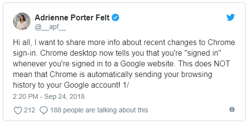 Google 最近可谓是反对声不断,那边审查版搜索引擎的事情还没平息,这边私自将 Chrome 和 Google 其他服务的登录凭据相互共享的举动又遭批判。 就在昨天,多家外媒报道最新版的 Chrome 69 在未通知用户的情况下,对登录信息进行了“内部服务共享”:在登录 Chrome 后,你打开其他 Google 服务时会自动使用此账号进行登录;相反,你在登录过任何 Google 的服务后,浏览器也将自动登录同一账号。